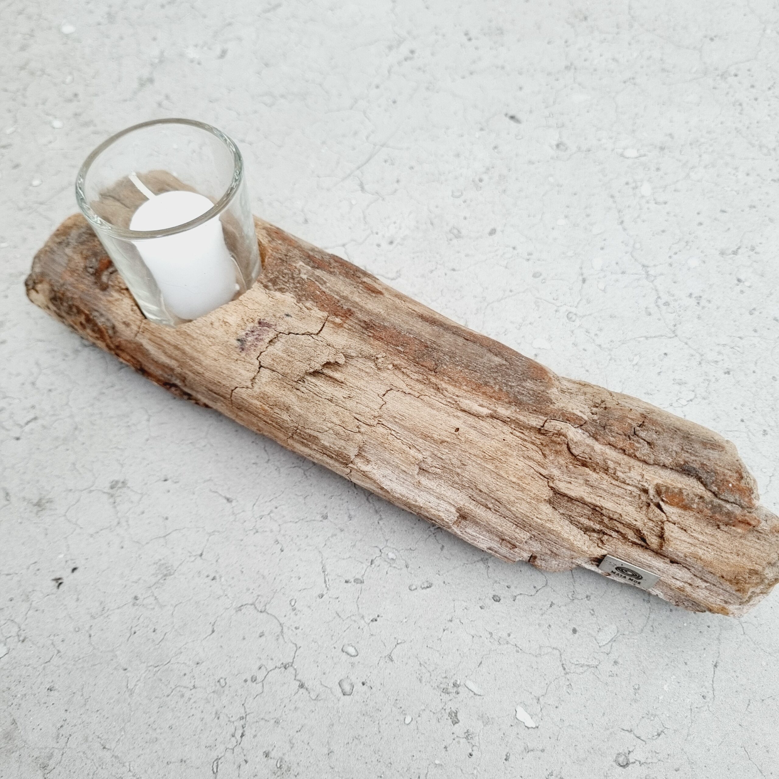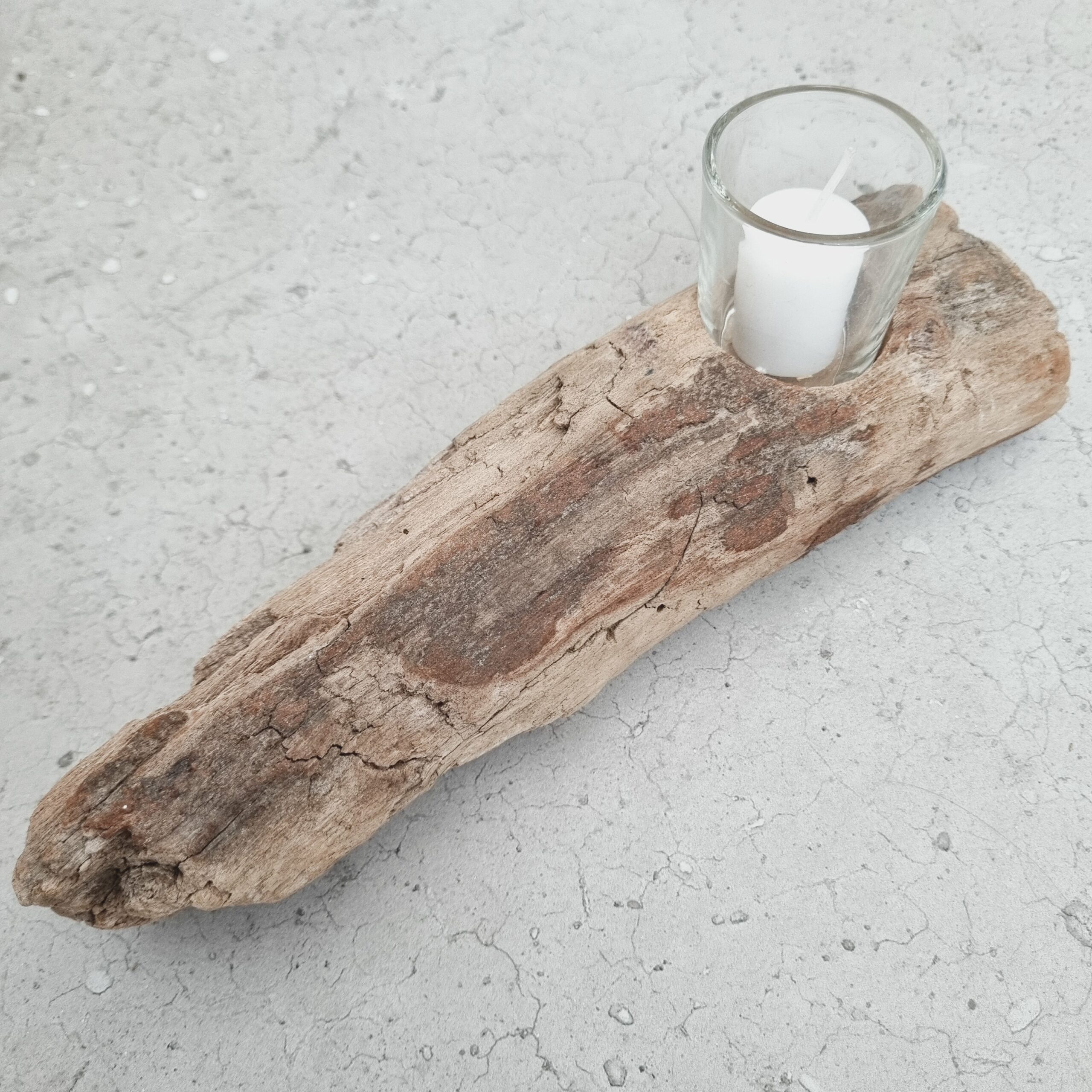 חתיכת עץ סחף מיוחד שנמצא בגדת נחל. נמשכתי לצורתו המיוחדת ולשלל גווני העץ שעליו והפכתי אותו למחזיק נרות שיקשט את ביתכם ויכניס אווירה חמימה וטבעית לביתכם.