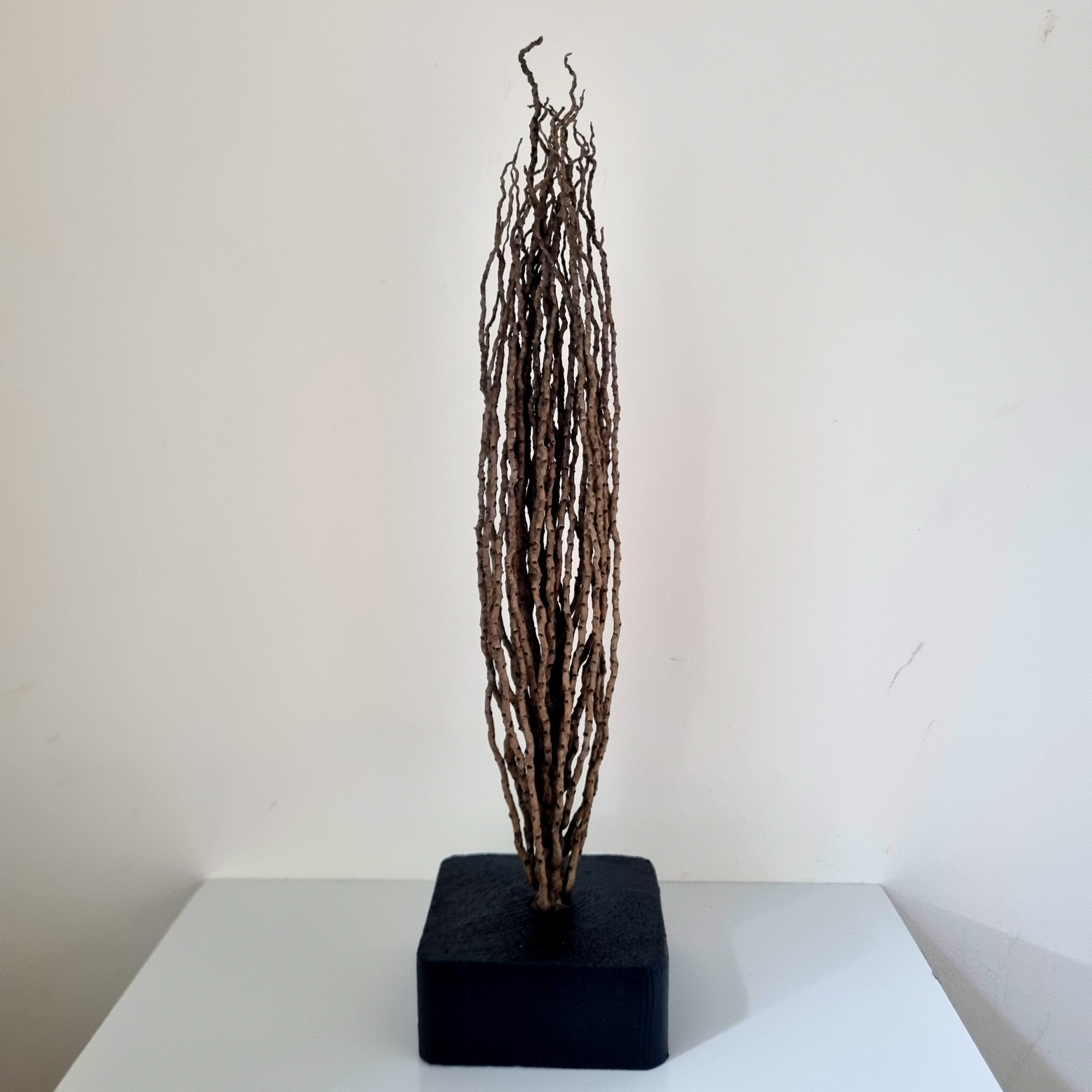 מקבץ יפיהפה של סנסנים מעץ הדקל מקובעים בתוך קוביית עץ צבועה בשחור