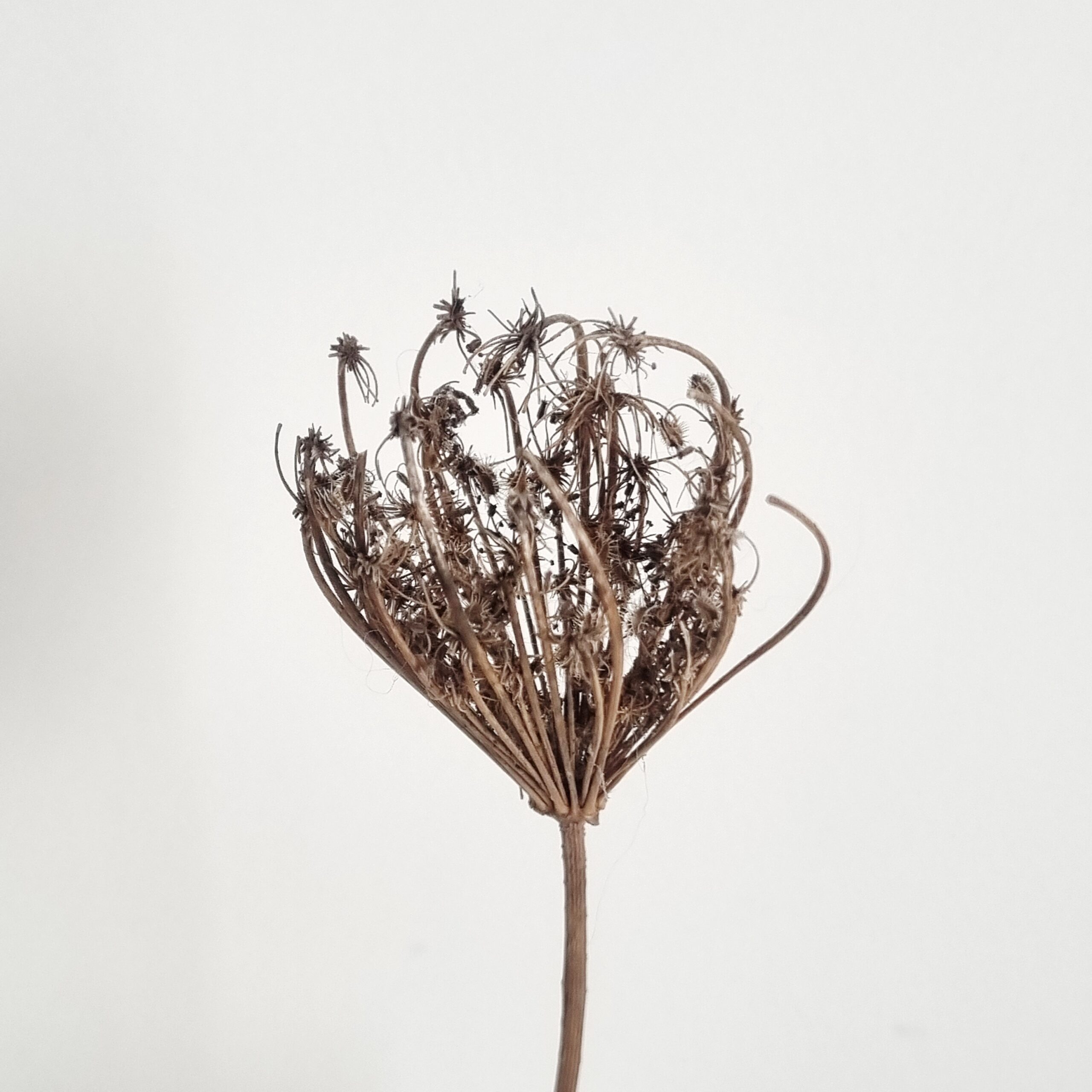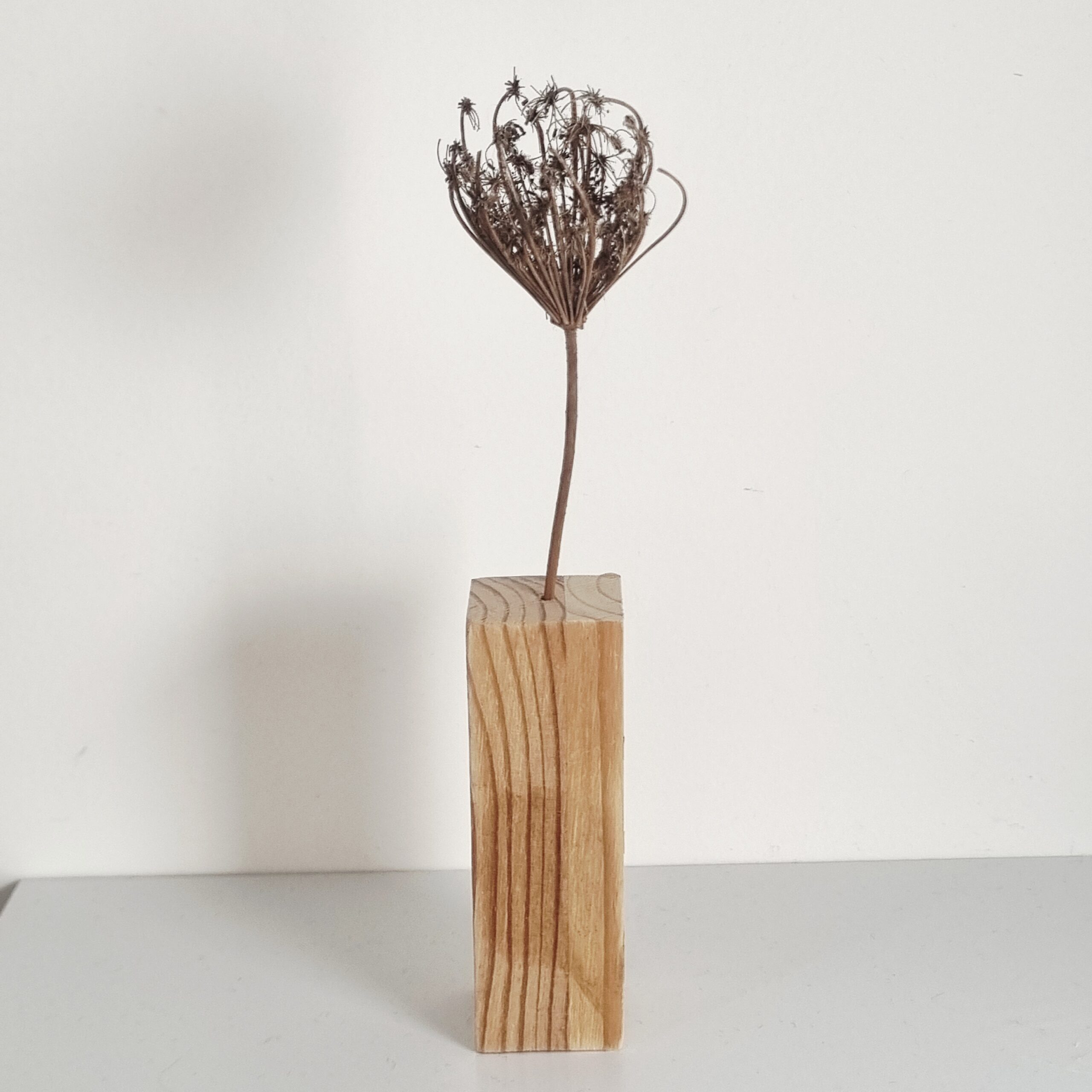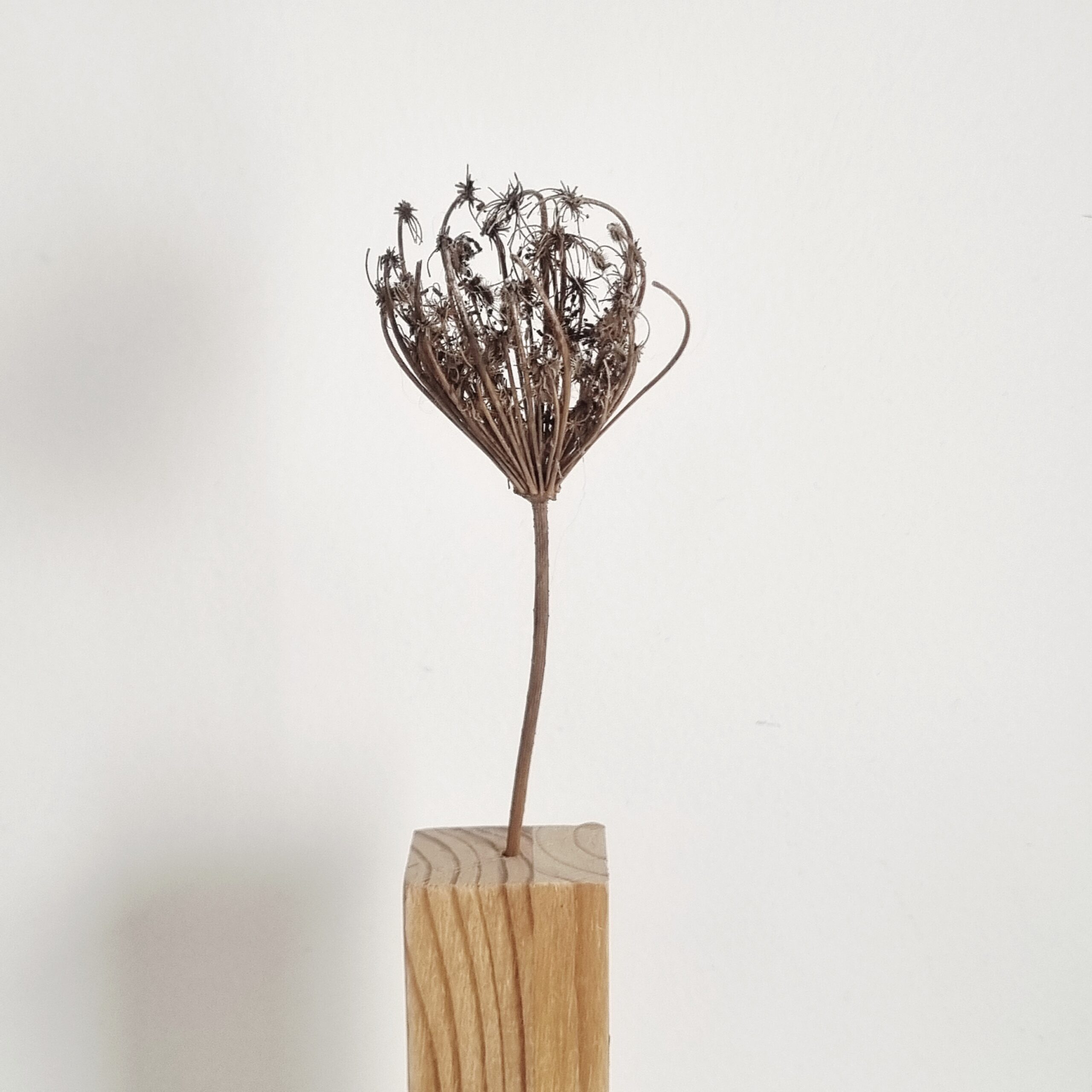 פרח יבש יפהיפה מצמח 'גזר קיפח' מקובע בתוך קוביית עץ